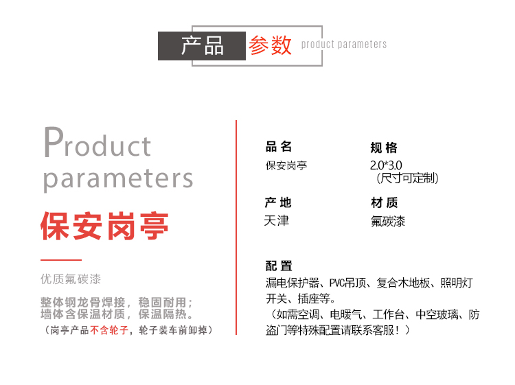 標(biāo)準(zhǔn)配置:外墻材質(zhì):氟碳漆板材及彩色不銹鋼;內(nèi)墻材質(zhì):優(yōu)質(zhì)白色防火密度板;墻體填充:阻燃聚苯(可選其他材質(zhì));門窗玻璃:?jiǎn)尾!摶?、有色玻璃可定制;其他配置:墻體含保溫材料、屋頂鍍鋅板靜電噴涂,PVC吊頂、室內(nèi)地面負(fù)荷木地板、照明燈、漏電保護(hù)、插座、開關(guān)。(如需加裝空調(diào)、定制等,請(qǐng)及時(shí)聯(lián)系客服)。咨詢電話:15822882616,公司網(wǎng)址:m.sn16888.com