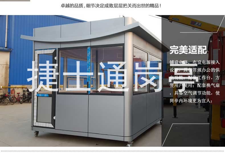 此款商品為氟碳噴涂氟碳噴漆的一款保安崗?fù)?,形象美觀,自然大方,可以用于工廠,行政機關(guān),開發(fā)區(qū)管理收費處,室外辦公室等,用的場合比較多,實用性比較大