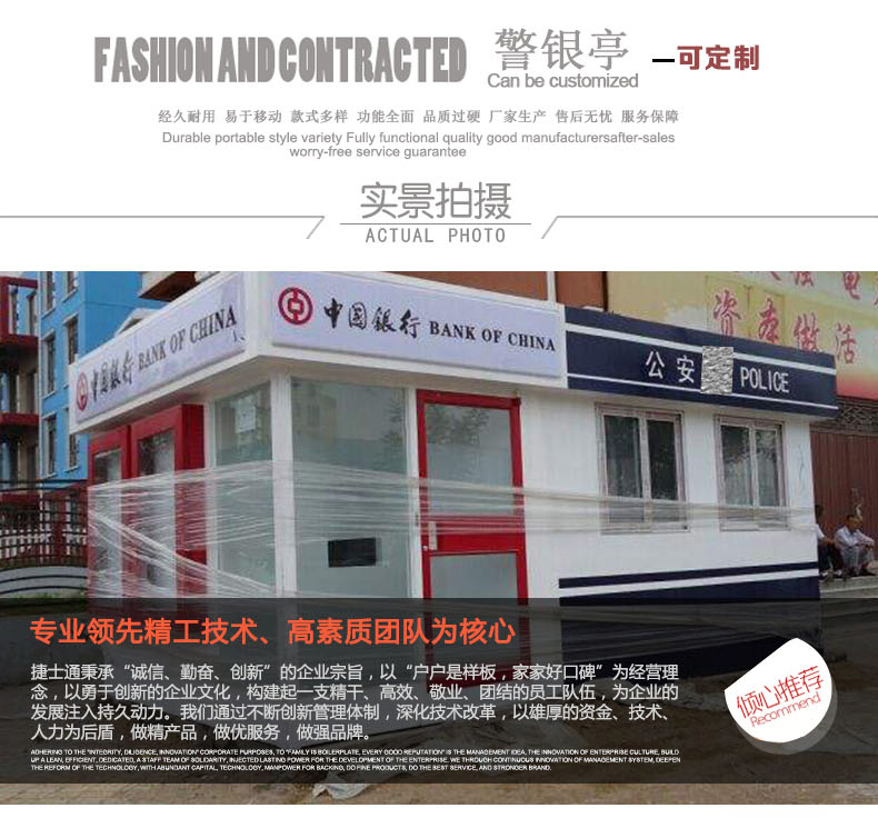 保安崗亭、收費崗亭、治安崗亭、智能安檢亭、高端崗亭、警亭、交通勸導站、學校傳達室、幼兒園門衛(wèi)室、售貨亭、移動廁所、智能吸煙亭、大型移動辦公室、大型設備房等大量現(xiàn)貨供應。