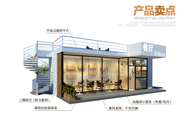 一個創(chuàng)新的商業(yè)空間載體不僅僅是捷士通移動房屋一直進取的方向,同樣也是諸多商業(yè)管理公司一直尋找的全新商業(yè)經(jīng)營模式,美好移動空間締造者捷士通移動房屋,經(jīng)積累的多年行業(yè)經(jīng)驗,通過運用裝配式房屋體系、鋼結(jié)構(gòu)為主體,搭配專利性墻體材料的形式,利用環(huán)保、便捷及美觀的設計理念,打造20-200平米輕奢移動商業(yè)空間體—售貨屋及整條街售貨屋、售賣屋系列。咨詢熱線:158 2288 2616