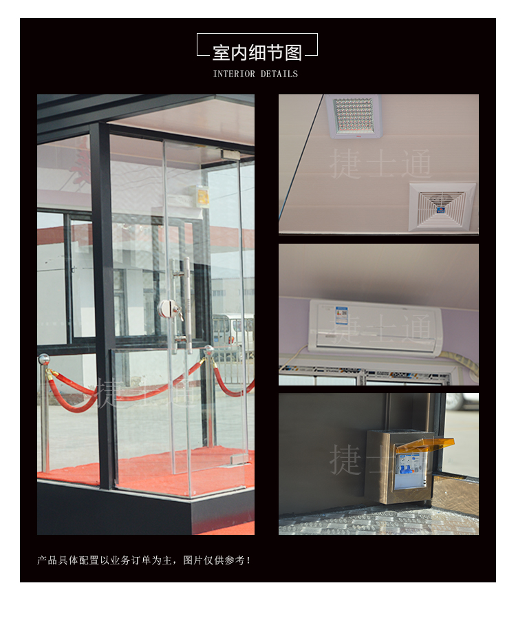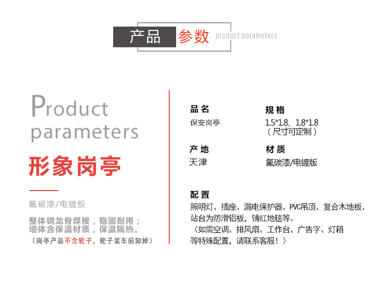 標(biāo)準(zhǔn)配置:形象崗?fù)?/a>墻體含保溫材料,屋頂鍍鋅板靜電噴涂,PVC吊頂,室內(nèi)地板復(fù)合木地板;加配裝置:工作臺(tái),抽屜,鍵盤,開關(guān)插座,暗敷線路(如需加裝空調(diào),請(qǐng)咨詢15822882616)。