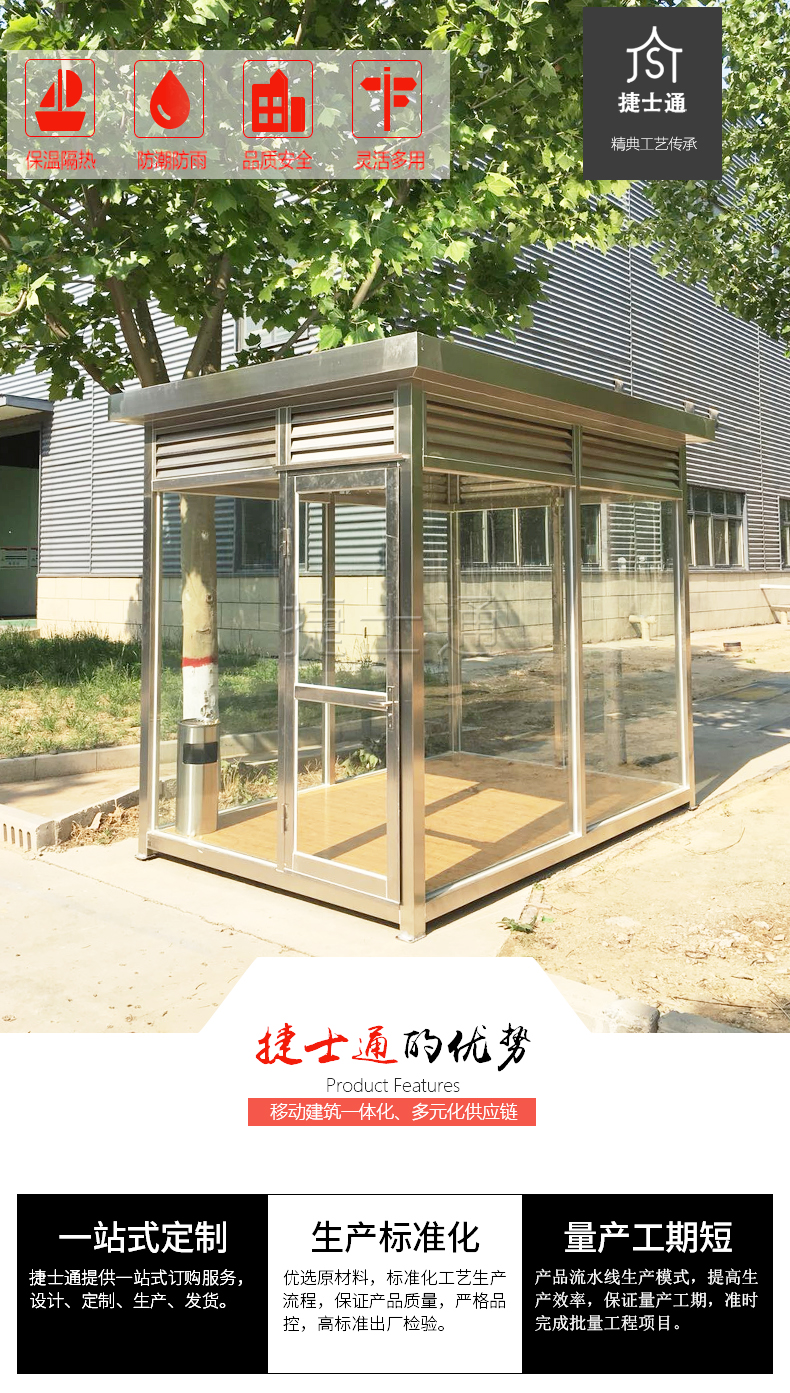 標(biāo)準(zhǔn)配置:屋頂鍍鋅板靜電噴涂,PVC吊頂,墻體玻璃材質(zhì)(鋼化、中空、有色玻璃等可定做),照明燈,漏電保護(hù)器,插座組,開關(guān),長凳,煙灰缸(如需空調(diào),排風(fēng)扇請(qǐng)聯(lián)系客服。咨詢電話:15822882616,公司網(wǎng)址:m.sn16888.com
