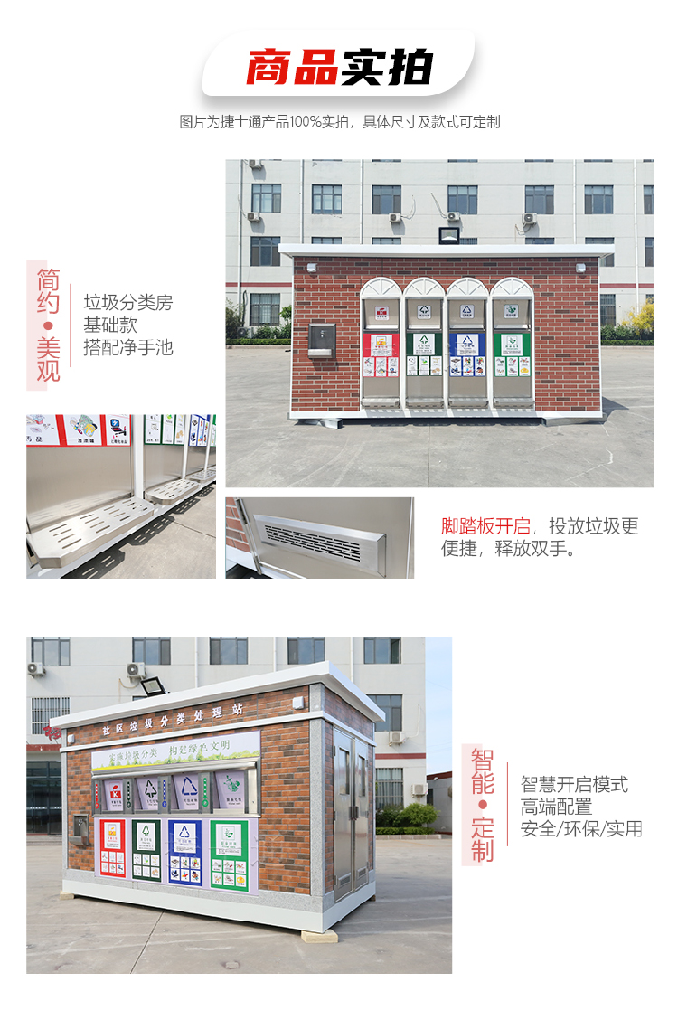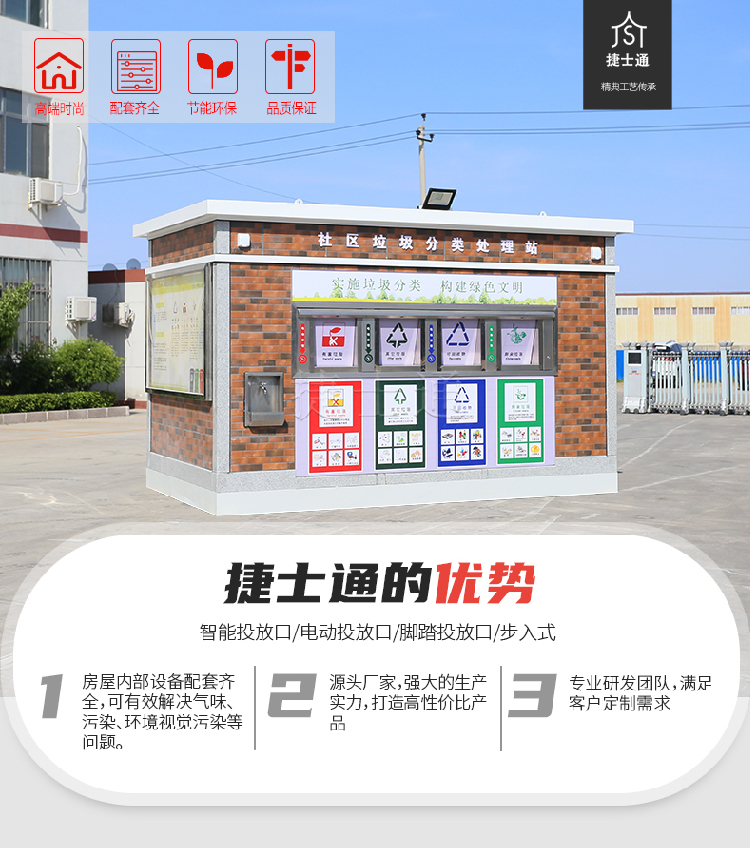 捷士通廠家擁有關(guān)于環(huán)保垃圾分類投放點(diǎn)豐富的設(shè)計(jì)、生產(chǎn)、銷售經(jīng)驗(yàn),可承接大中小型項(xiàng)目,歡迎您的咨詢。