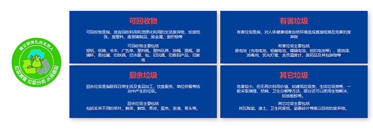 垃圾分類,是指按照垃圾的不同成分、屬性、利用價(jià)值以及對環(huán)境的影響,并根據(jù)不同處置方式的要求,分成屬性不同的若干種類。通俗的講,垃圾分類就是在源頭將垃圾分類投放,并通過分類收集、分類運(yùn)輸和分類處理,實(shí)現(xiàn)垃圾減量化、資源化、無害化處理。