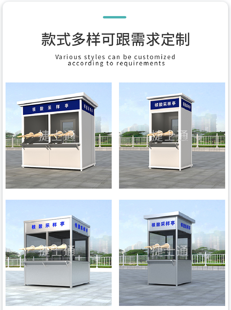 核酸采樣亭一般采用的是304不銹鋼或者是一體板材質(zhì),為什么是這個(gè)材質(zhì)?因?yàn)椴讳P鋼和一體板在捷士通來(lái)說(shuō),都是可以做為流水批量生產(chǎn),在交貨方面非???,效率高,短時(shí)間大批量生產(chǎn),能很快滿足一個(gè)城市或者3-5個(gè)城市的需求量,能達(dá)到這個(gè)水平的廠家少之又少,而且我們的技術(shù)都是很完善的,有需求的客戶可以隨時(shí)聯(lián)系我們,我們一定做到以安全為自認(rèn),盡職盡責(zé)為國(guó)家服務(wù)