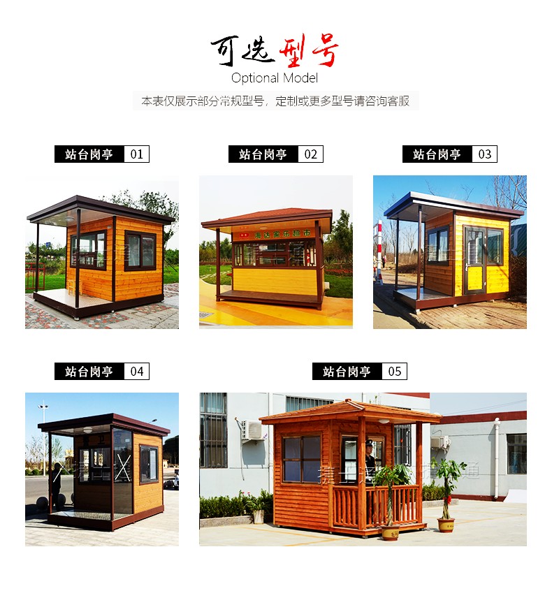 崗亭按照使用材料分為:不銹鋼崗亭、鋼結構崗亭、玻璃崗亭、防腐木崗亭、真石漆崗亭、金屬雕花板崗亭……
