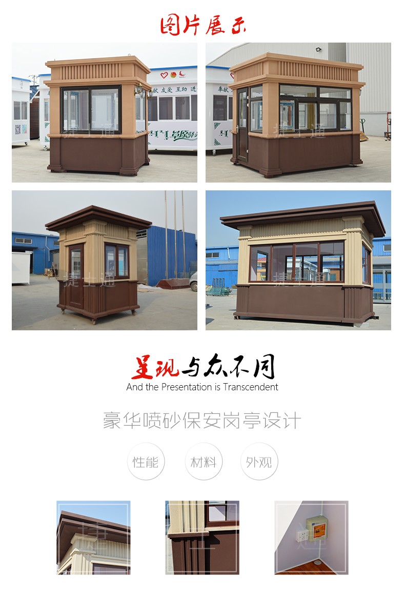 產(chǎn)品介紹:隨著雨后春筍一樣各種小區(qū)的出現(xiàn),對(duì)崗?fù)さ男枨笠瞾碓絹碓礁?。市?chǎng)上比較熱銷的有鋼結(jié)構(gòu)崗?fù)?、不銹鋼崗?fù)?、金屬雕花板崗?fù)さ?。但是隨著小區(qū)的增多這些崗?fù)さ目钍揭呀?jīng)無法滿足業(yè)主的要求,大家都希望安裝在自己小區(qū)的崗?fù)つ艽蚱瞥R?guī),更加的有個(gè)性和特色。而我們的真石漆保安崗?fù)?/a>就應(yīng)運(yùn)而生。真石漆保安崗?fù)ね鈮Σ捎玫氖翘烊坏氖?,從肉眼就可以到外墻呈顆粒狀,立體感非常的強(qiáng)。