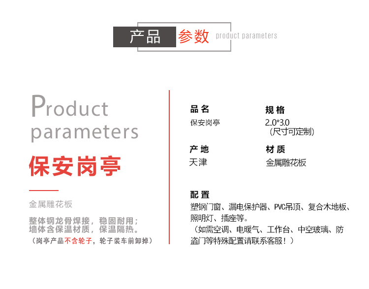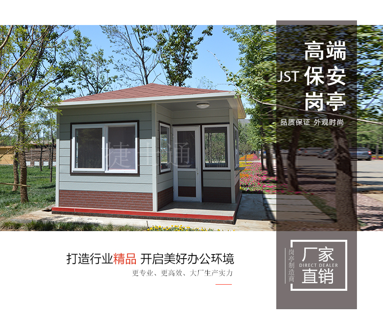 保安崗?fù)け韺邮墙饘倜鎸?,使用壽命長(zhǎng)達(dá)十幾年之久,且綠色環(huán)保,多功能新型亭子;崗?fù)げ馁|(zhì)表面經(jīng)特殊工藝制作加工處理,穩(wěn)固耐用;采用龍骨焊接而成,強(qiáng)度高,抗風(fēng)壓。使用吊車(chē)或者叉車(chē)卸貨之后,固定到位連接電源即可使用。