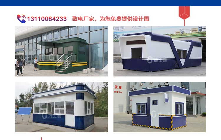 1、崗?fù)こS靡?guī)格: 2.0*1.8 ,2.0*2.5m,2.0*3.0m尺寸也可根據(jù)需要量身定做,高度一般為2.5m2、崗?fù)ぶ黧w骨架采用優(yōu)質(zhì)鋼龍骨,強(qiáng)度高,抗風(fēng)壓;(也可用金屬雕花板或不銹鋼)3、崗?fù)な覂?nèi)頂部為豪華pvc扣板,地板為花紋鋁板,4、崗?fù)ろ敳坎牧喜捎锰厥夥浪q接工藝,徹底解除漏水之患;5、崗?fù)づ溆虚_關(guān)、日光燈、電源、電源插座,桌面、電話插座、空調(diào)插座、技防線方便使用;6、內(nèi)墻板為鋁塑板,外墻板為1.2mm不銹鋼板,表面可做浮碳處理,顏色可自由選擇;7、崗?fù)らT窗:不銹鋼門窗;8、款式、尺寸多樣可量身定做底座可配滑輪。