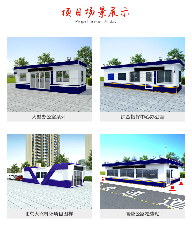在高速路口進行管制的時候,需要大量的工作人員,在辦公的時候?qū)嵭?4小時3-4班導(dǎo),針對這樣的工作場地以及工作時間,高速路口的工作類型檢查站是必不可少的,一般采用的是大尺寸可移動戶外移動房屋等類型,采用的顏色一般為警藍色