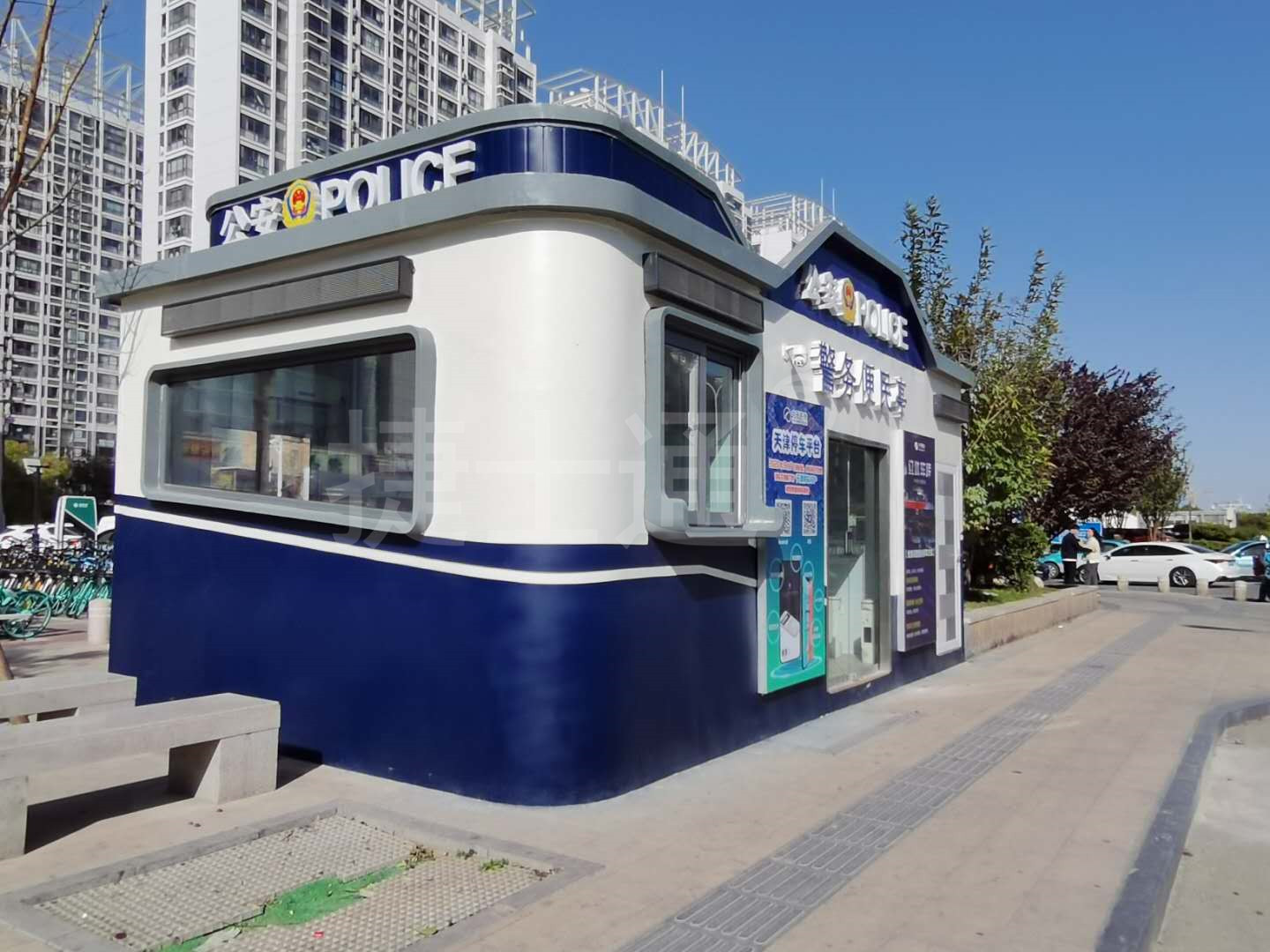 在公交處設(shè)立值班室成品房,可加強(qiáng)治安力度,提升群眾生活安全質(zhì)量,顏色采用警藍(lán)色和白色,整體莊嚴(yán)肅靜,深入人心 。