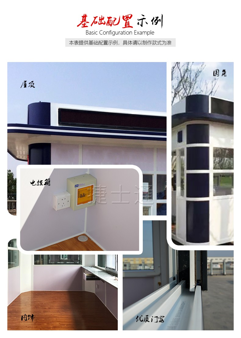 活動窗:鋼質(zhì)型材,玻璃:5mm鋼化玻璃,內(nèi)頂:豪華PVC吊頂,外頂:采用鋼龍骨架支撐,鍍鋅鋼板壓力成型焊接,
